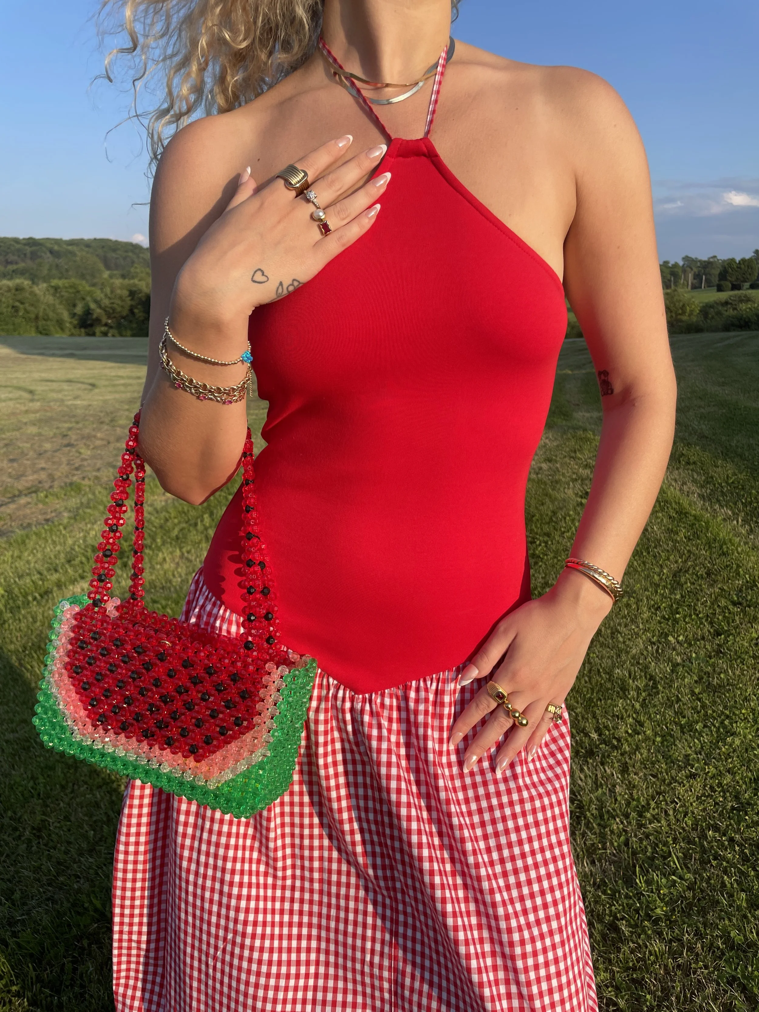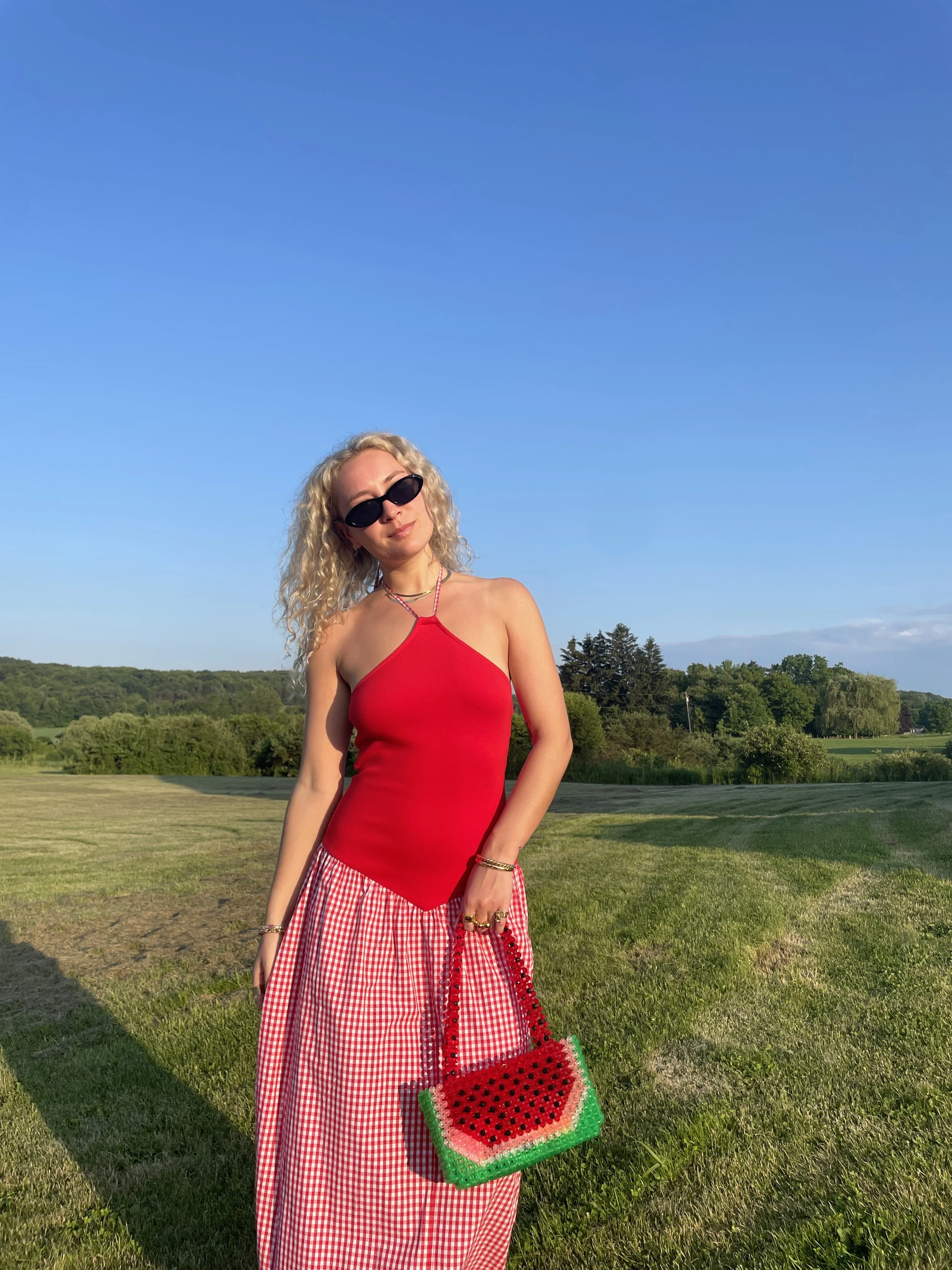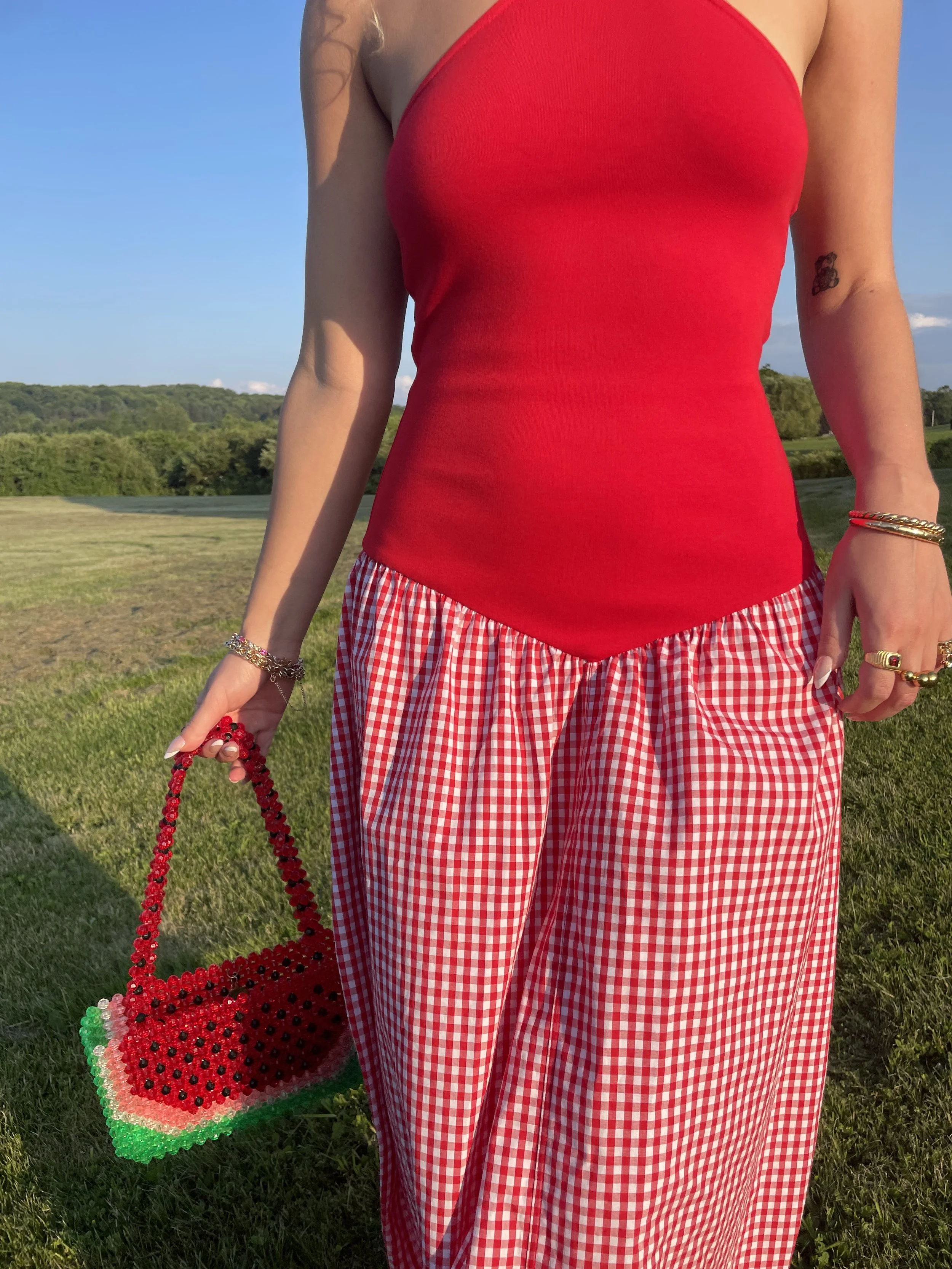 An easy statement. This full-length halter dress features a soft jersey bodice with an open back and a cotton skirt that moves with you. Designed to sit drop waisted with an adjustable tie neck.
